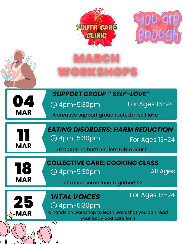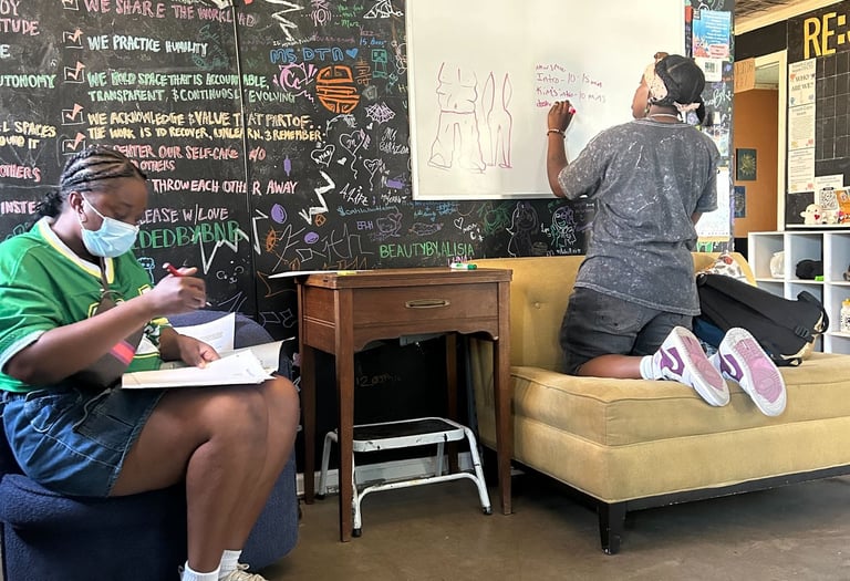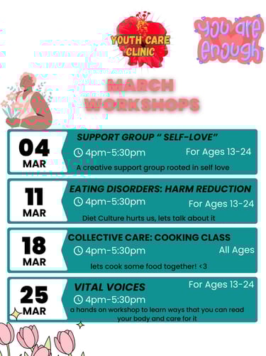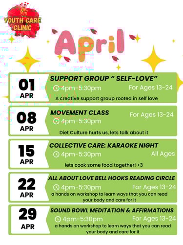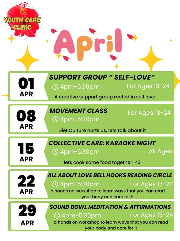 Offered in the Fall, Spring, and Summer, cohorts are paid training experience for teens 15 - 18 years old or 8th to 12th grade, to learn community health systems, trauma-informed care, and peer support models. Our youth-led curriculum makes shifts away from capitalism and big pharmaceutical companies by focusing on mutual aid, education, and advocacy. We learn alternative and holistic health practices to reduce reliance on western medicine. Cohorts create healing resources at the Clinic as part of their hands-on learning.